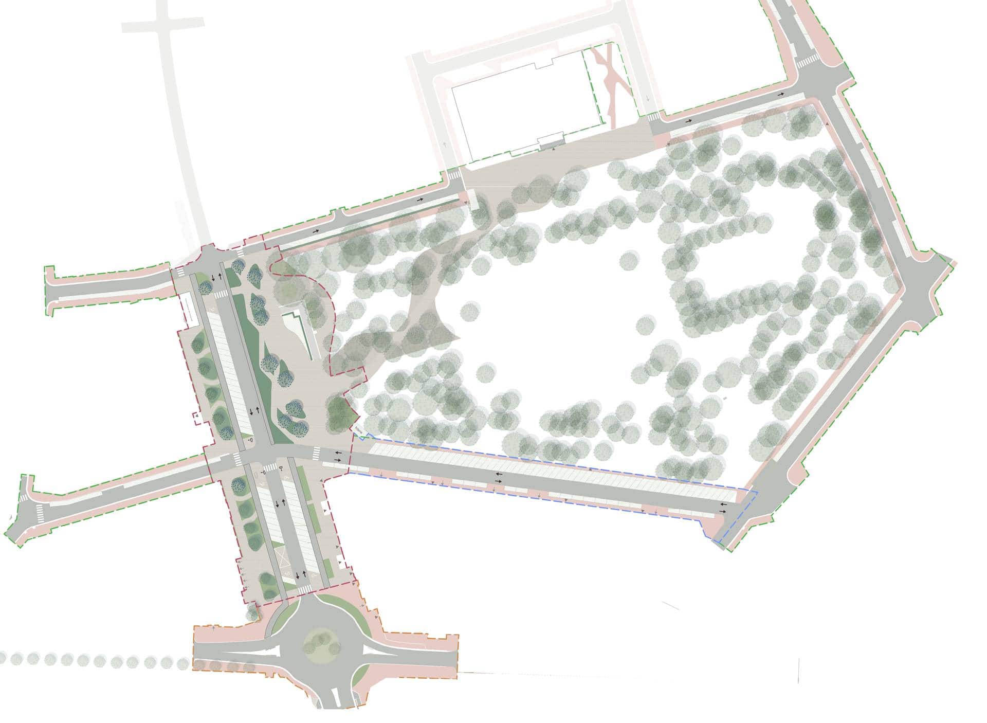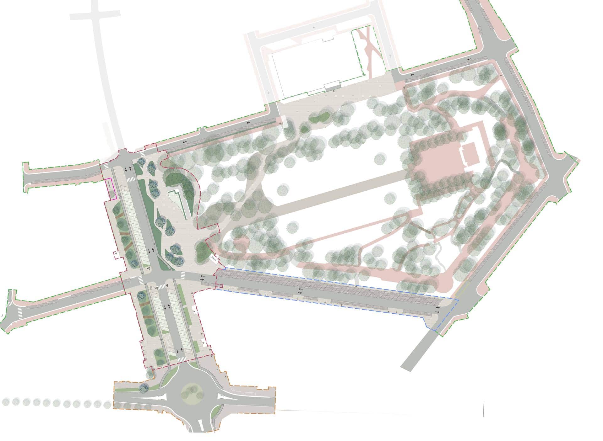 Un lien visuel et physique est créé avec le musée des beaux-arts, les limites du parc sont retravaillées tout en conservant les arbres existants. Au bout du chemin, un parvis, généreux, accompagné d’œuvres d’art.