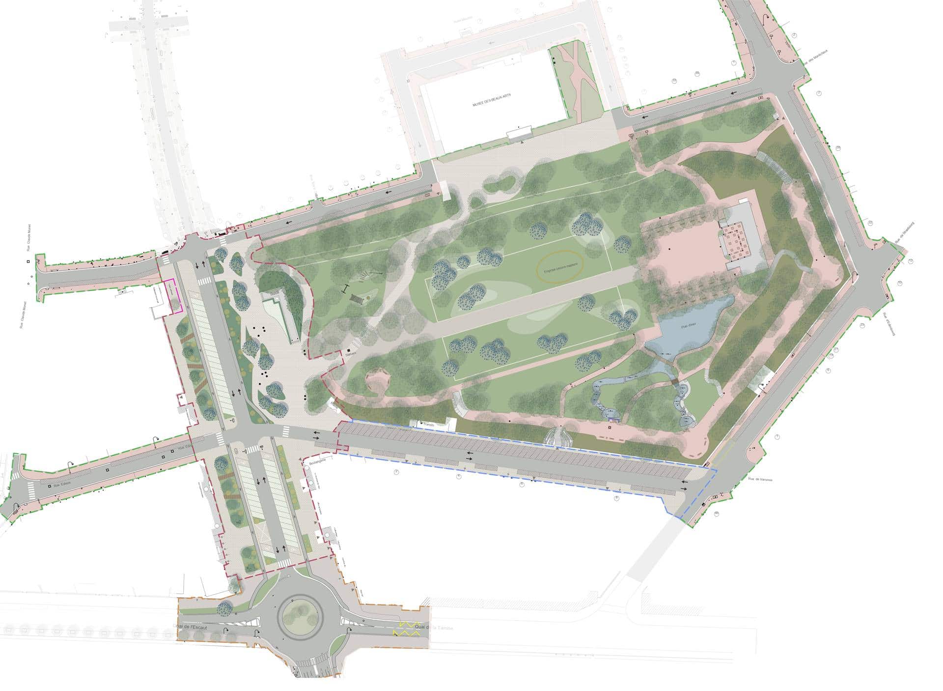 Les pelouses centrales du parc se voient élargies par rapport à son dessin d’après-guerre. Pour maintenir les traces du passé les limites des deux parterres de pelouses existants sont symbolisés par une ligne en pavé ou une lisse enterrée ondulant au gré des buttes tout comme le cheminement au nord du parc.
