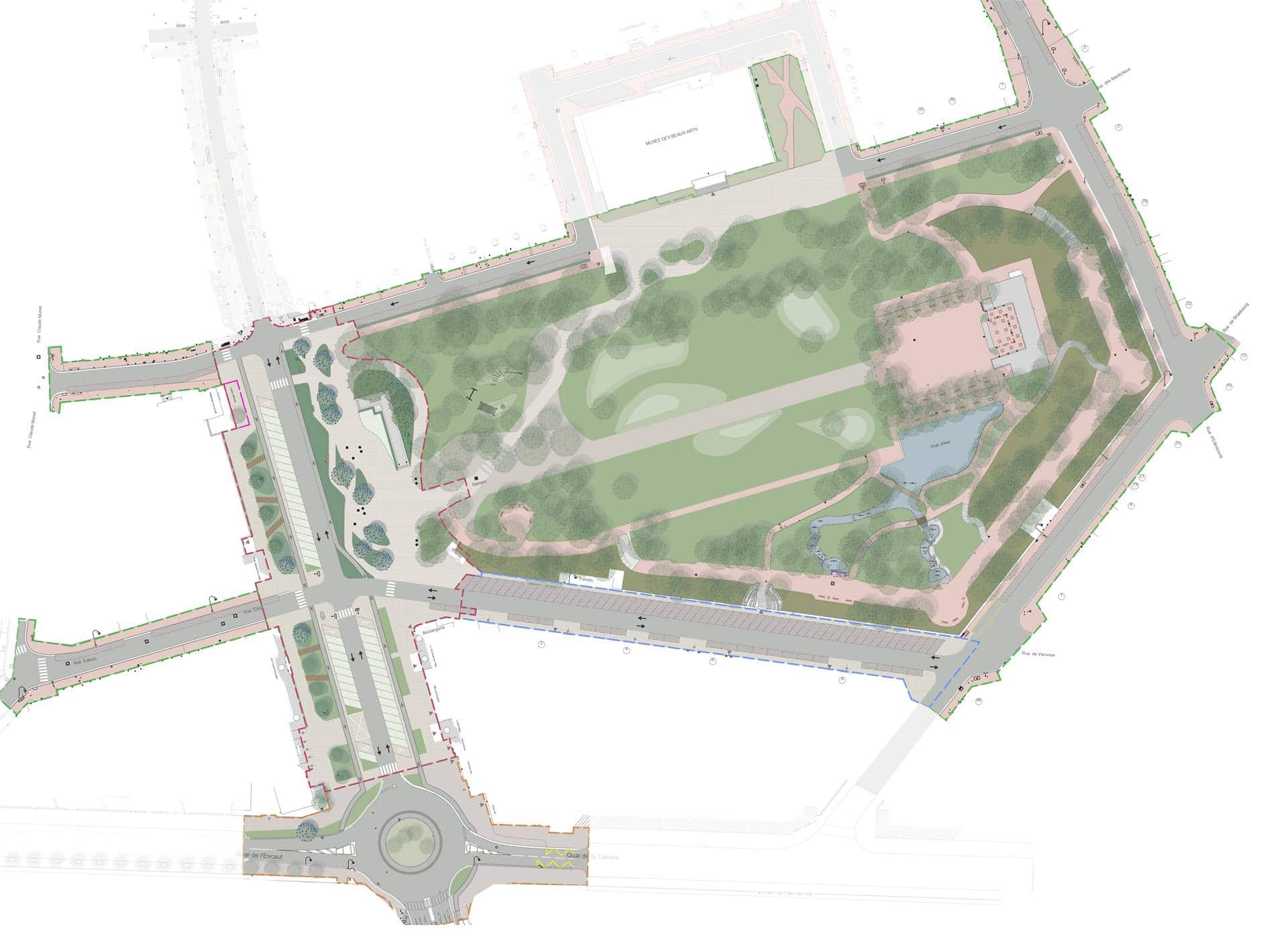 Les cheminements principaux du parc sont conservés, ils mettent en avant les différentes ambiances qu’il propose. De cette façon l’archipel d’ambiances est conservé avec la promenade haute, le bassin et ses pontons, le théâtre de verdure...